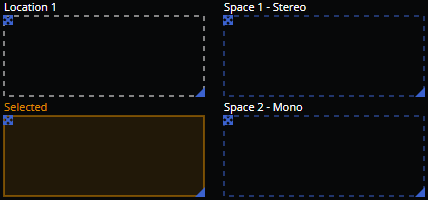All locations have a grey dashed outline while acoustic spaces will have a blue dashed outline. The name of the location or space appears just above the upper left corner of the location outline. While a location or space is selected during the Locations action it, and it's name text, is highlighted with a copper color and the outline is solid instead of dashed.