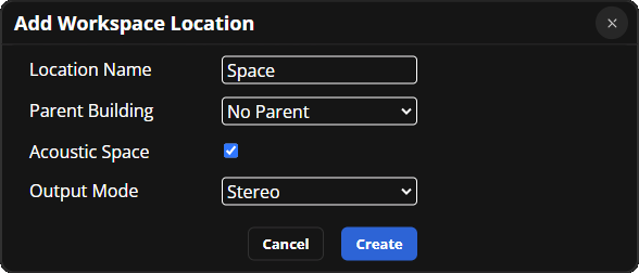 Acoustic Space: Checkbox that, when checked, will create acoustic space instead of a location. If left unchecked, a location will be created. Information about acoustic spaces is provided below in the Add Spaces section.