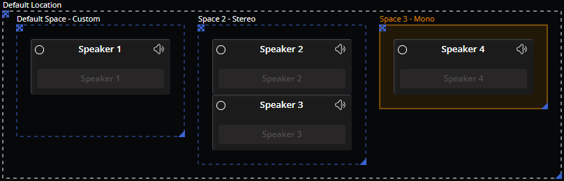 By default VenueTune opens with a location and a space on the workspace. Default Location is a location that is a parent to the default space. Default Space is an acoustic space with Custom selected as an Output Mode. These can both be renamed and moved as normal but cannot be deleted from the workspace.