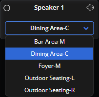 Workplace drop-down menu: Choose a location to add newly created speakers to. The list of locations will be restricted to acoustic spaces. The letter designation next to each location is the output mode for that acoustic space.
