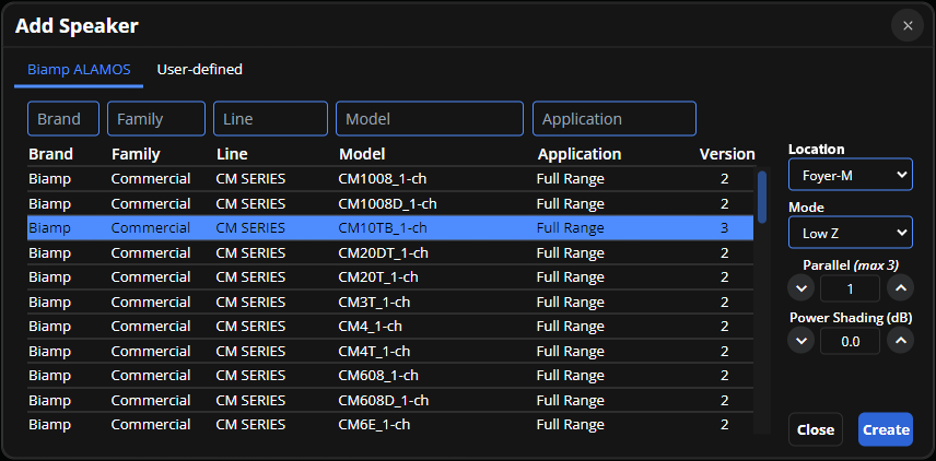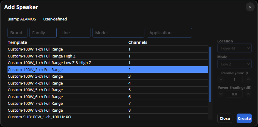 Create and Close: Add one or more speakers with selected settings to the workspace using the Create button. The Add Speaker menu won't close until the close button is selected.