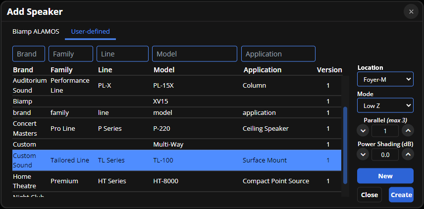 User-defined Tab: Add saved custom loudspeaker files created using the VenueTune custom loudspeaker template menu. Loudspeaker files created using The Voltera Configuration dialog, within Tesira Design Software, are also available. Custom speaker files are populated from storage (OneDrive or similar) using the path This PC/Documents/Biamp/Loudspeakers folder.