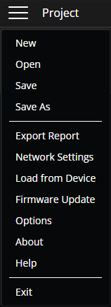 Load from Device: A project file may be retrieved from a device and applied to a system. Select a device from the list to retrieve a project file from that device. Each device will appear on a separate line even if those devices share the same project file.